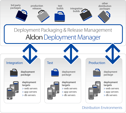Com Aldon Deployment Manager podemos economizar tempo e reduzir os erros para implementação de software, automatizando os numerosos e repetitivos passos na distribuição de objectos para outras máquinas ou partições lógicas. Empacotar e distribuir objectos para os locais de destino designados em cada estágio do ciclo de desenvolvimento, sejam eles ficheiros código-fonte, objectos compilados, gráficos, documentos ou páginas da web.